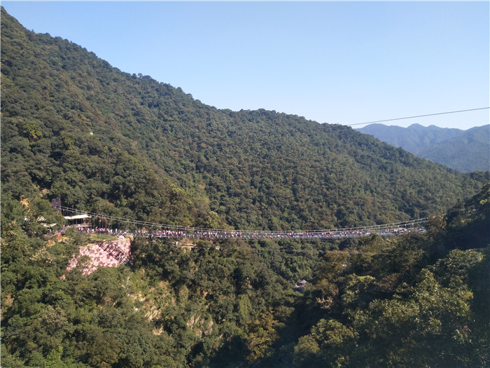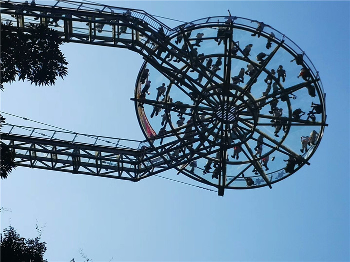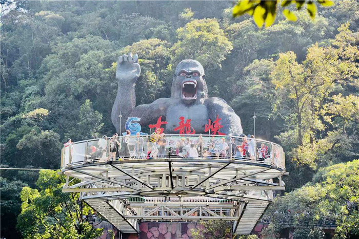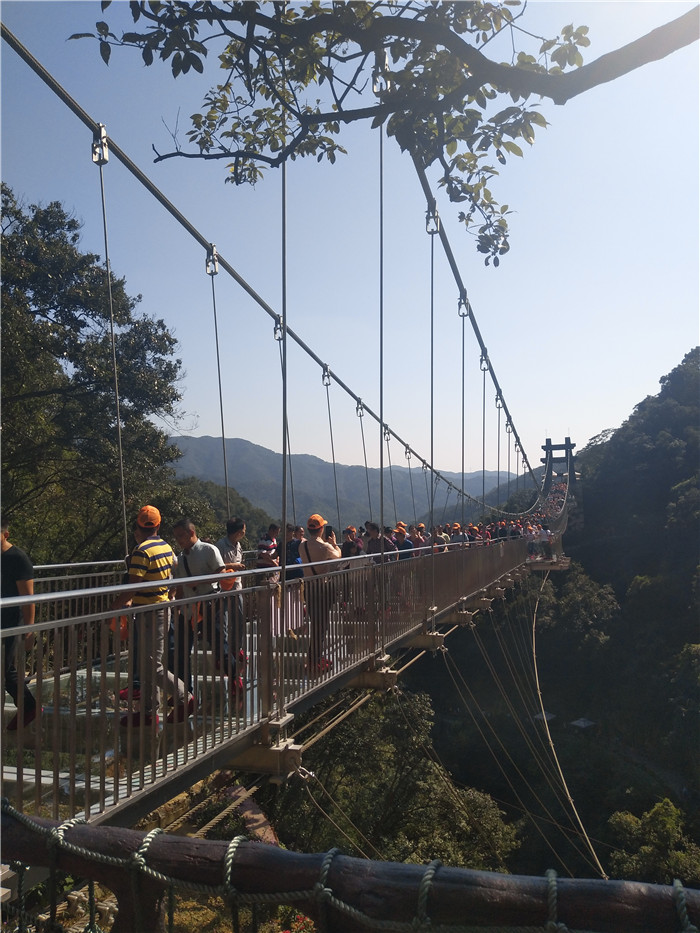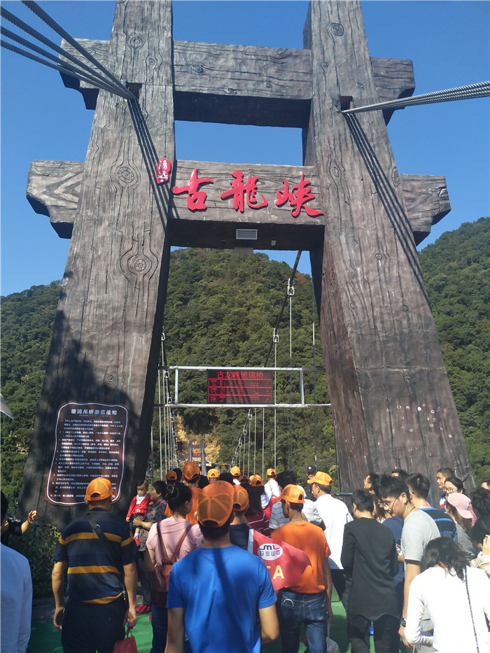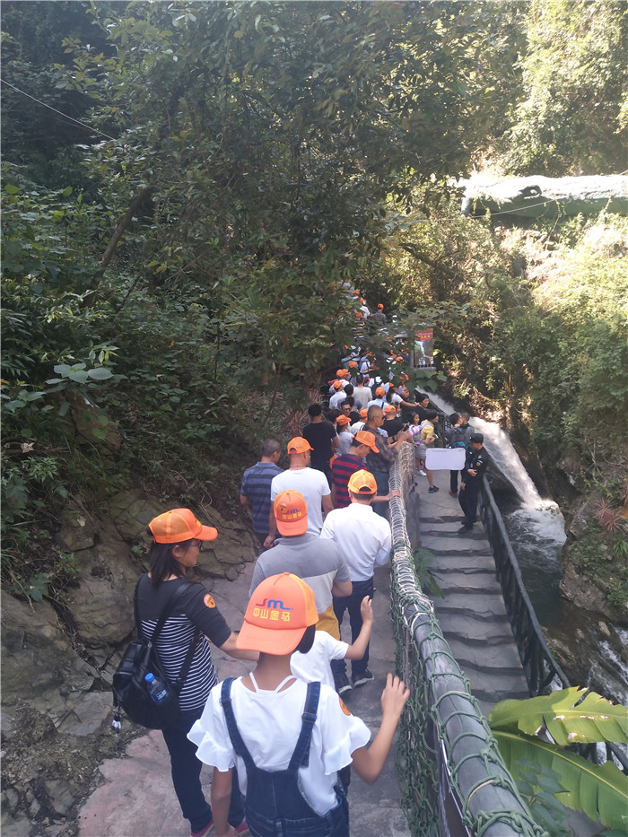 抵達目的地1——清遠古龍峽云天波霸。這個以獲得四項世界紀錄著稱的景區(qū)景區(qū),逢周末閑日和天公作美,此刻更是人山人海,縱使如此,500多名金馬人們仍是呈現(xiàn)出了良好的團體素質和修養(yǎng),文明就餐、有序排隊、耐心等候......景區(qū)內仿佛形成了一道新的橙色人文風景線。隨后,沿途爬山、觀光、賞瀑、自拍、擺拍、合影......歡笑和驚呼連綿不斷。走上最大規(guī)模的高空觀光玻璃組合云天波霸,驚險和刺激正式登場:世界最長最寬的329米觀瀑玻璃橋、UFO造型的懸空玻璃平臺、“守護神”巨型猩猩雕塑,漫步其中,猶如閑庭散步;俯視下方,卻又步步驚心!