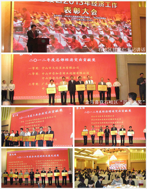 2013年3月29日中午,中山市人民政府石岐區(qū)辦事處舉辦了2013年度經濟工作表彰茶話會,在過去一年里,金馬積極加快轉型升級的步伐,各項工作取得了突破性的發(fā)展,在大會上喜獲石岐區(qū)經濟工作“四重大獎”。