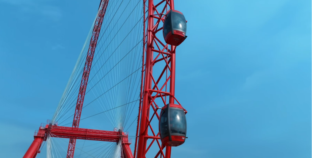 值得關注的是,金馬游樂在該項目上應用了兩項創(chuàng)新技術方案,確保摩天輪的舒適及安全。吊廂伺服調平技術,令每個吊廂在運行中始終處于水平狀態(tài),大幅提升吊掛式轎廂受到風載荷時的平穩(wěn)性;雙驅動系統(tǒng)獨立運作方案,增強安全冗余,緊急狀況下無高空救援風險。