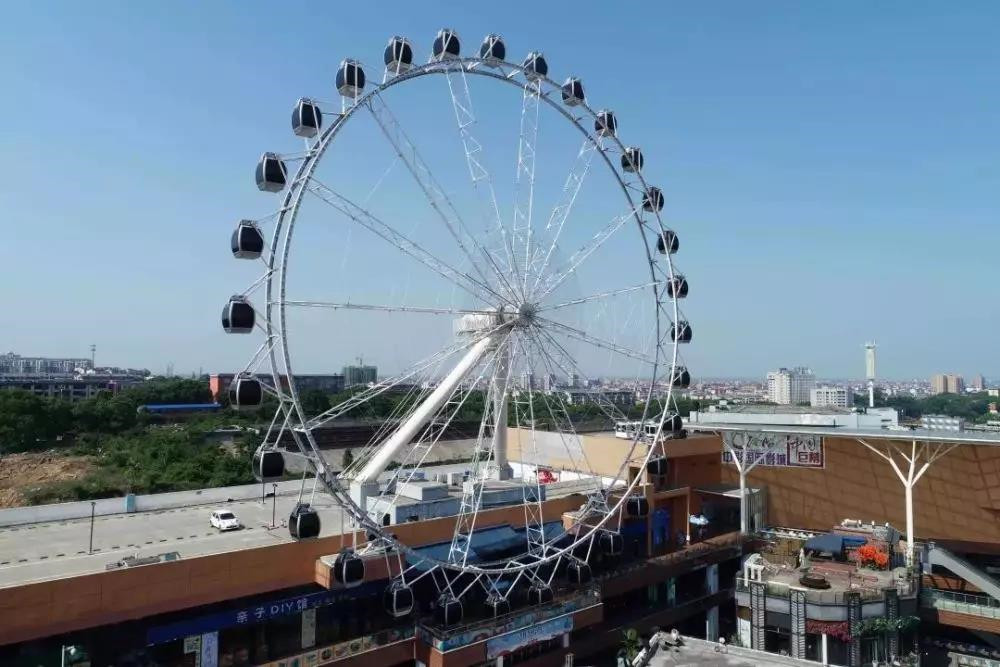 GLC-52A觀覽車是中山金馬自主研發(fā)的觀覽車類游藝機(jī)。整個(gè)產(chǎn)品由塔架、主軸、轉(zhuǎn)盤、吊廂、驅(qū)動(dòng)系統(tǒng)組成。塔架由2根立柱構(gòu)成,分布在轉(zhuǎn)盤一側(cè),整個(gè)轉(zhuǎn)盤呈懸臂梁結(jié)構(gòu),在塔架支撐的基礎(chǔ)上增加鋼索固定。主軸水平布置,主軸上的轉(zhuǎn)筒隨著設(shè)備運(yùn)行而轉(zhuǎn)動(dòng)。轉(zhuǎn)盤采用桁架式結(jié)構(gòu),轉(zhuǎn)盤上均勻地分布著30個(gè)吊廂,每個(gè)吊廂最大乘客量6人。游客乘座吊廂沿轉(zhuǎn)盤運(yùn)行,體驗(yàn)著觀光賞景的樂趣;新穎獨(dú)特的懸臂結(jié)構(gòu),再配以明麗變幻、動(dòng)感迷人的燈飾,別具匠心的現(xiàn)場(chǎng)配景,以及柔美動(dòng)聽的背景音樂,使得本設(shè)備深受游客的歡迎,也是一個(gè)重要的城市地標(biāo)。