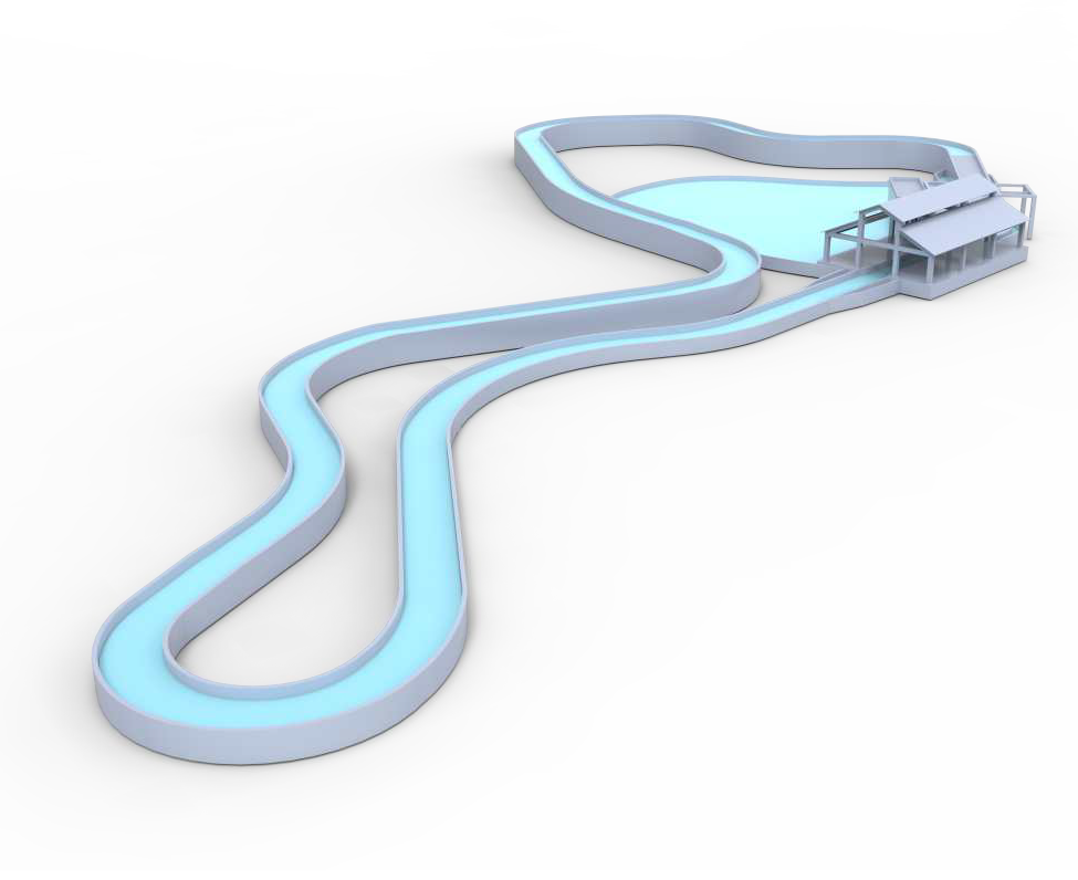 峽谷漂流,筏體經(jīng)提升系統(tǒng)由站臺提升至水道的高位后,由主泵推動的流水驅(qū)動前進。船速由水道形狀決定,通過水底阻水堰的定位設(shè)置來制造洶涌的水波,沿途可對水道兩旁進行景觀包裝來制造融入自然的環(huán)境,讓游玩體驗更親近大自然。