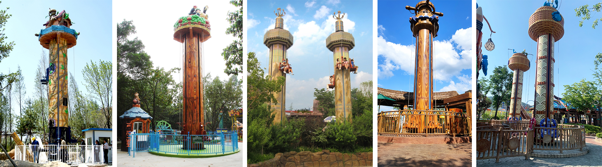 在乘客拉繩操作下快速升、降或停留在半空;快速上升時,因要雙手交替拉繩,使人產(chǎn)生一種攀爬向上的感覺;快速下降時又有高處下落的刺激;老、少咸宜。