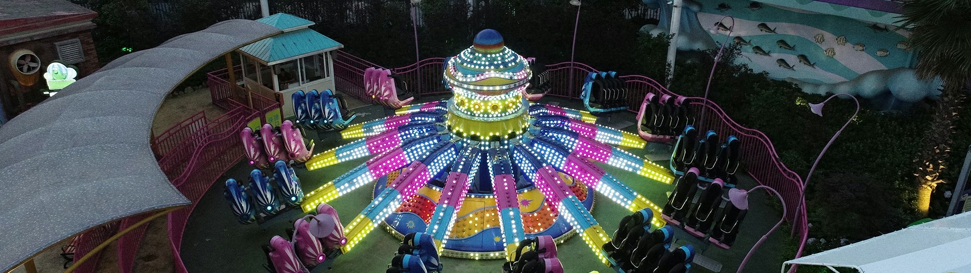 彈跳機(jī)中軸為中心帶動(dòng)周圍十四個(gè)座艙繞豎直中軸旋轉(zhuǎn),同時(shí)座艙伴隨著音樂進(jìn)行高低、快慢不同的跳躍式運(yùn)動(dòng)。使乘客在過程中體驗(yàn)到旋轉(zhuǎn)加跳躍的樂趣。