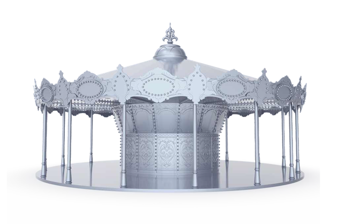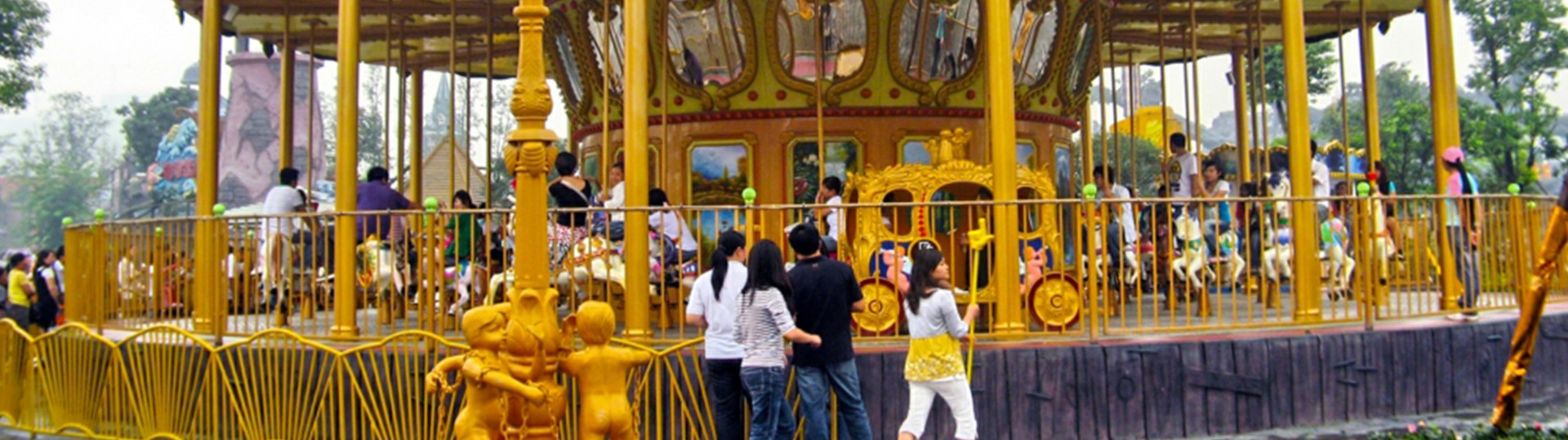 轉(zhuǎn)馬采用動(dòng)物音樂會(huì)裝飾主題,轉(zhuǎn)臺(tái)周邊鑲嵌彩色花草圖案,搭配有音樂符號(hào)的裝飾花板,并配以變幻的燈彩。轉(zhuǎn)臺(tái)上有吹奏彈唱的各類小動(dòng)物坐騎、造型別致的馬車。游客踏上轉(zhuǎn)馬,猶如踏入了小動(dòng)物們的狂歡派對(duì)之中。