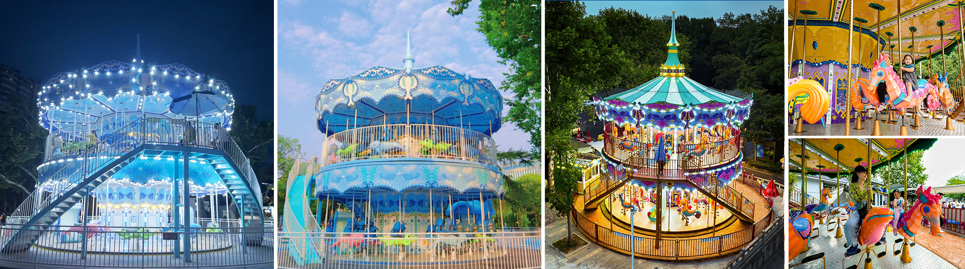豪華雙層轉(zhuǎn)?是上、下層可單獨(dú)作旋轉(zhuǎn)運(yùn)動(dòng)的裝飾豪華的轉(zhuǎn)?,采?歐式古典豪華的裝飾?格。蓬頂?shù)幕使诩馑睕_云宵,天花板、內(nèi)圍板鑲嵌著彩?浮雕,并配備彩燈。?匹及宮庭式??結(jié)合多彩的花飾,造型夢幻華麗?碧輝煌。