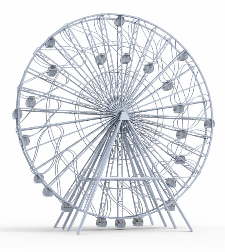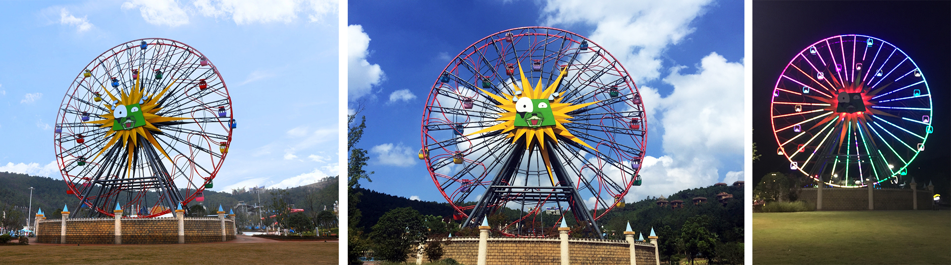 46米搖擺觀覽主體采用經(jīng)典的桁架式結(jié)構(gòu),轉(zhuǎn)盤設(shè)計(jì)有8個(gè)固定座艙及16個(gè)搖擺座艙,兩種不同的座艙形式分別給乘客以傳統(tǒng)游覽車及滑行車的不同體驗(yàn)。吊廂運(yùn)作時(shí)配以明麗變幻的燈飾,搭配別具匠心的內(nèi)飾配景,以及柔美動(dòng)聽的背景音樂(lè),乘客在吊箱內(nèi)多?度地縱覽周邊美景。