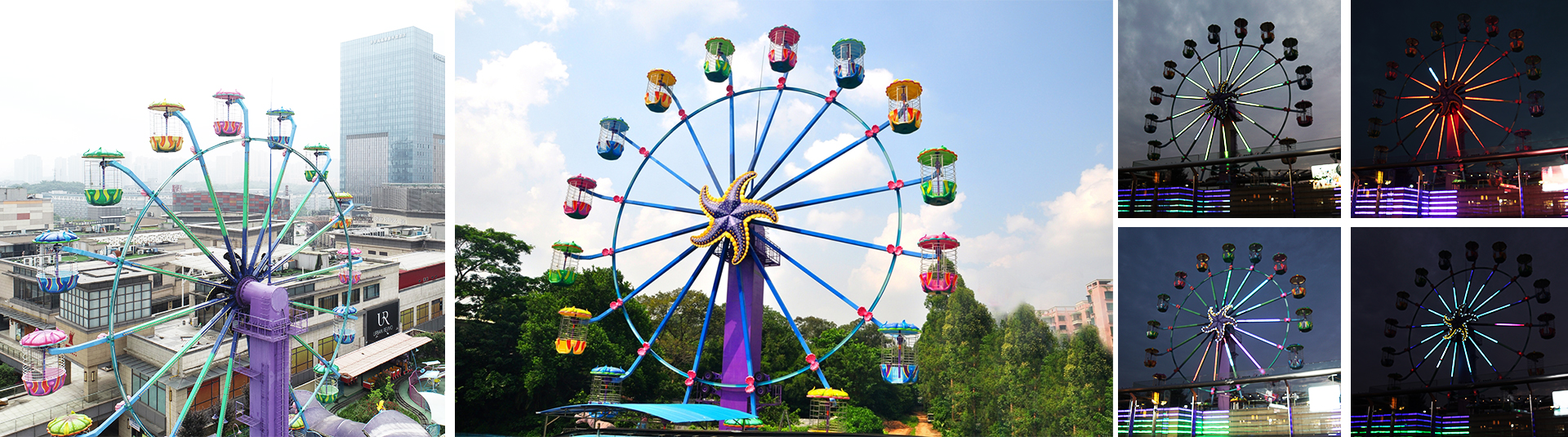 ?型摩天輪可承載48?,主要由?柱、塔頭、旋轉(zhuǎn)頭、轉(zhuǎn)輪、避雷針、吊籃、驅(qū)動(dòng)裝置和電?系統(tǒng)等組成,并配備燈光和?響。設(shè)備外觀萌趣、造型?巧精致,能為樂園??提升歡樂?氛,是公園和游樂場(chǎng)很受歡迎的觀覽游樂設(shè)備。