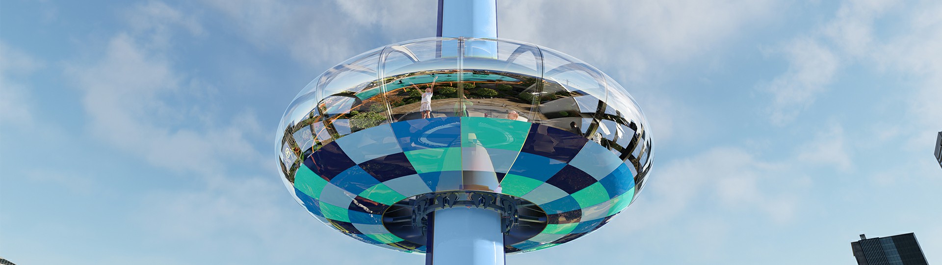觀景塔擁有可容納100人的“甜甜圈”旋轉(zhuǎn)艙體,載客能力強。雙自動門進出口的設(shè)計便于快速上下客,運營高效。乘客在旋轉(zhuǎn)艙中360°環(huán)繞式縱情飽覽四周美景,還可通過艙內(nèi)影音系統(tǒng)感受多元視覺盛宴。夜幕降臨燈光閃耀,璀璨奪目輕易打造夜場焦點,成為聚客地標。