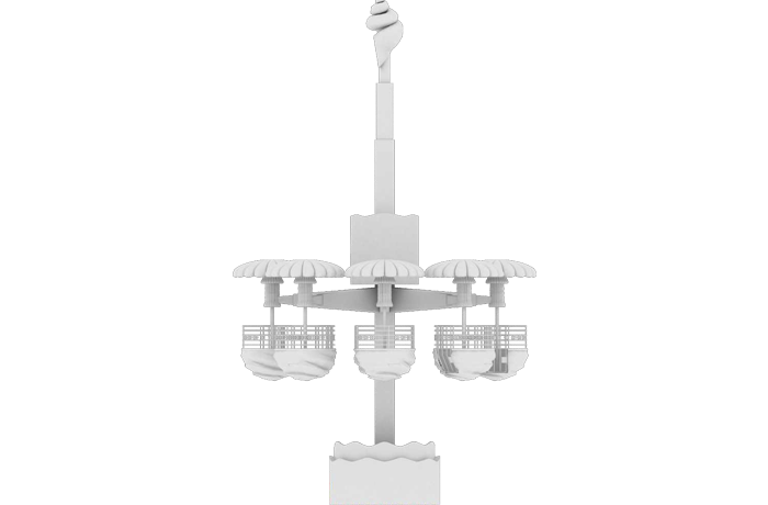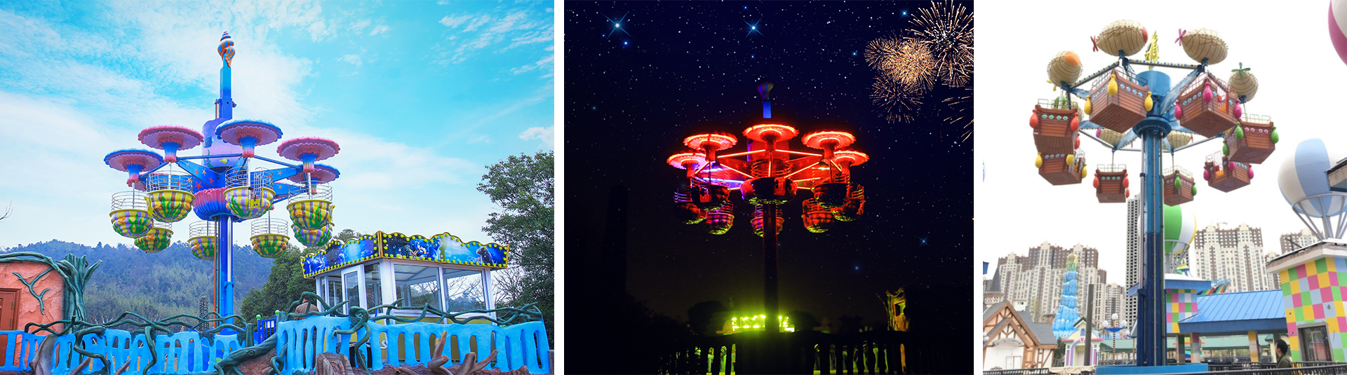 逍遙塔集旋轉(zhuǎn)、升降兩大運(yùn)動(dòng)形式于一體。設(shè)備啟動(dòng)后,座艙在升降時(shí)繞立柱中心軸旋轉(zhuǎn),同時(shí)座艙還可以自由旋轉(zhuǎn)。雙重旋轉(zhuǎn)感受搭配升降帶來的失重與超重感,為游客提供豐富的乘坐體驗(yàn)。