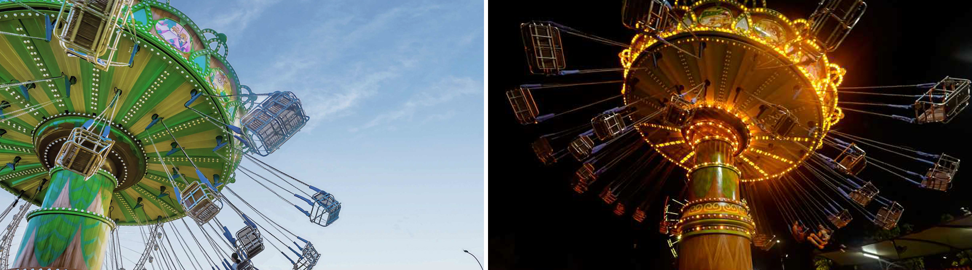 颶風飛椅設(shè)備通過傘形轉(zhuǎn)盤的旋轉(zhuǎn)和中間轉(zhuǎn)臺的錯位旋轉(zhuǎn),實現(xiàn)飛椅的波浪式運動,乘客猶如在空中自由飛翔飄蕩。此款飛椅設(shè)有2人座艙,適合家庭親?或情侶游客游玩。