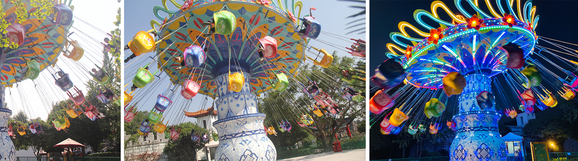 颶風飛椅設備通過傘形轉盤的旋轉和中間轉臺的錯位旋轉,實現(xiàn)飛椅的波浪式運動,乘客猶如在空中自由飛翔飄蕩。