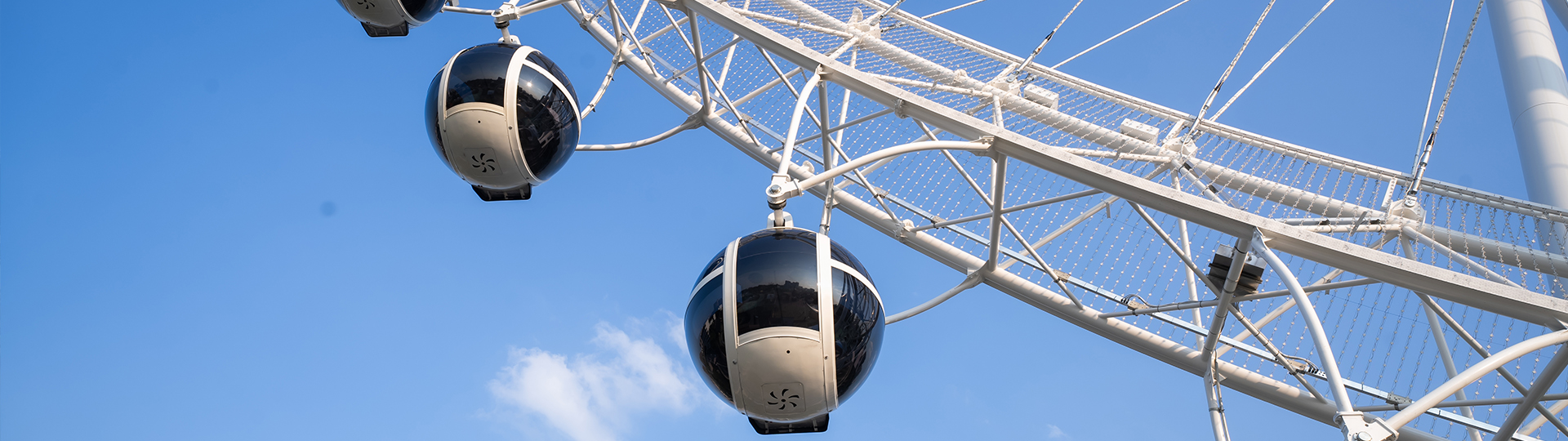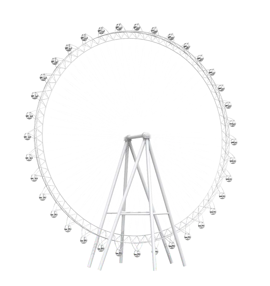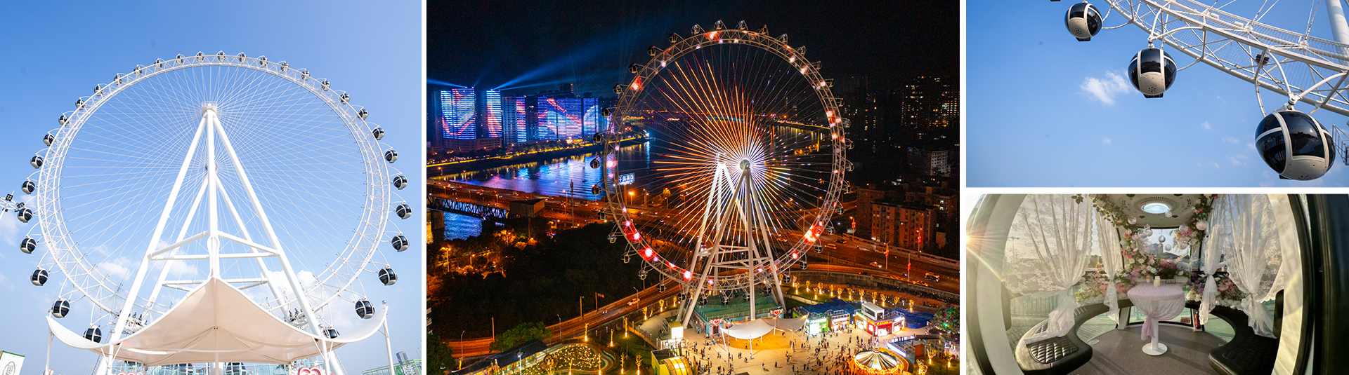 88?觀覽?,塔架由6根?柱構(gòu)成,觀覽?的設計打破傳統(tǒng)摩天輪的界限,將拉膜造型與摩天輪相互結(jié)合,融為?體,使摩天輪在感官上更加宏偉壯觀,專為地標項?打造。夜幕降臨,摩天輪運作時配以明麗變幻的燈飾與外觀造型相互呼應,使得摩天輪成為閃耀的地標打卡點。